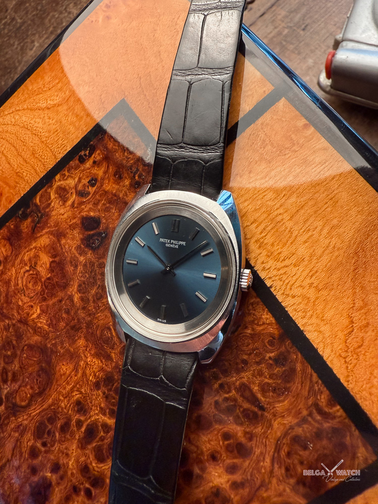 Exceptional steel Calatrava with an electric blue dial.